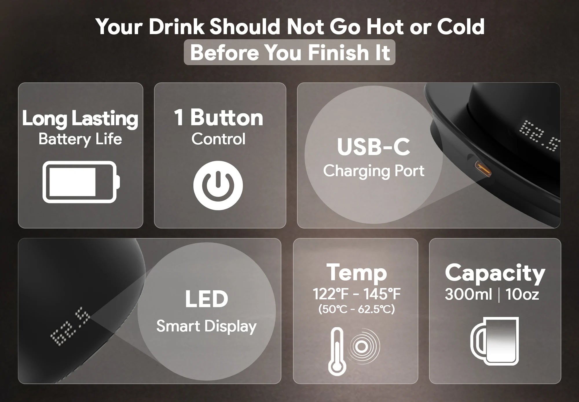 When placed on the charging coaster, it keeps drinks warm for hours at your selected temperature.
