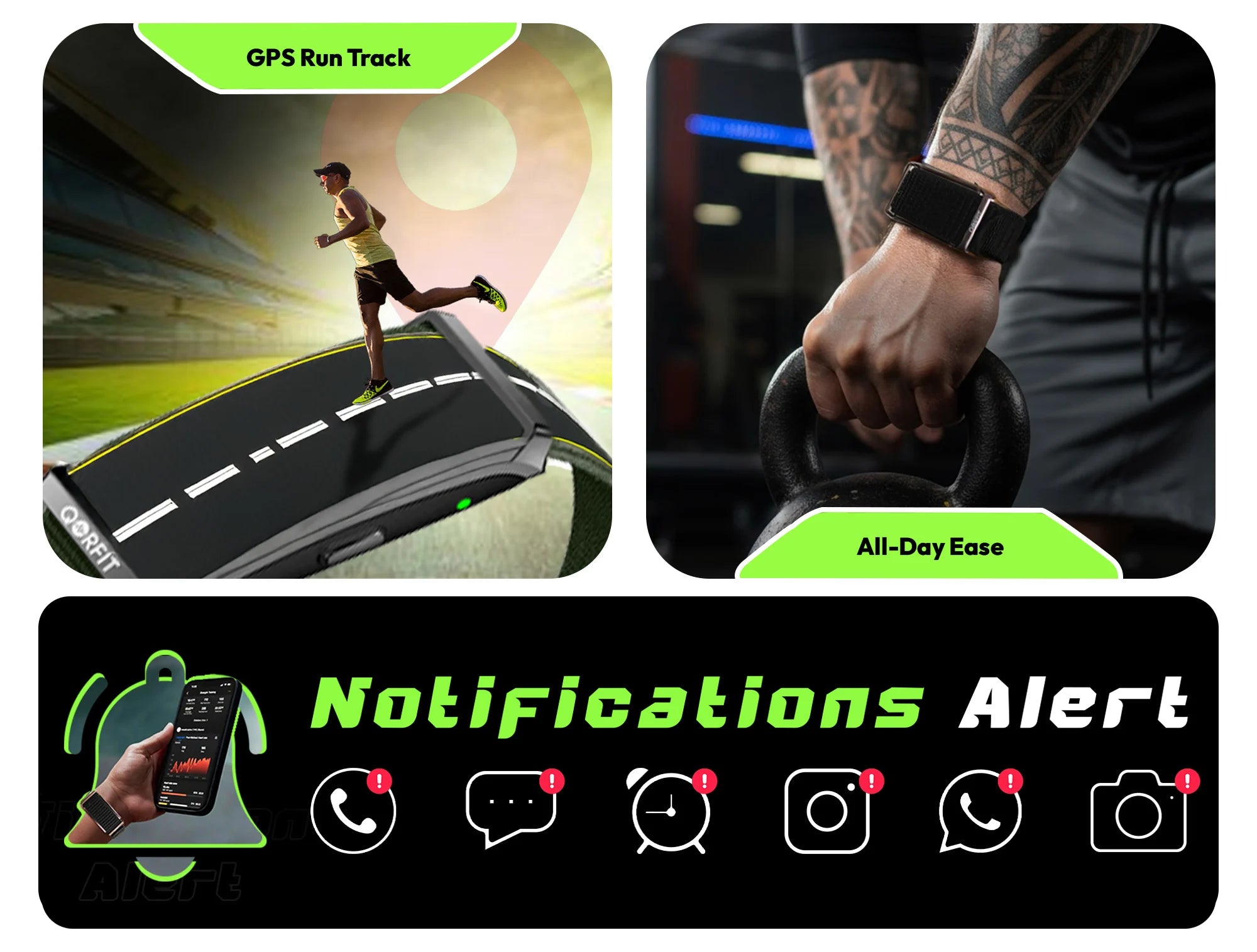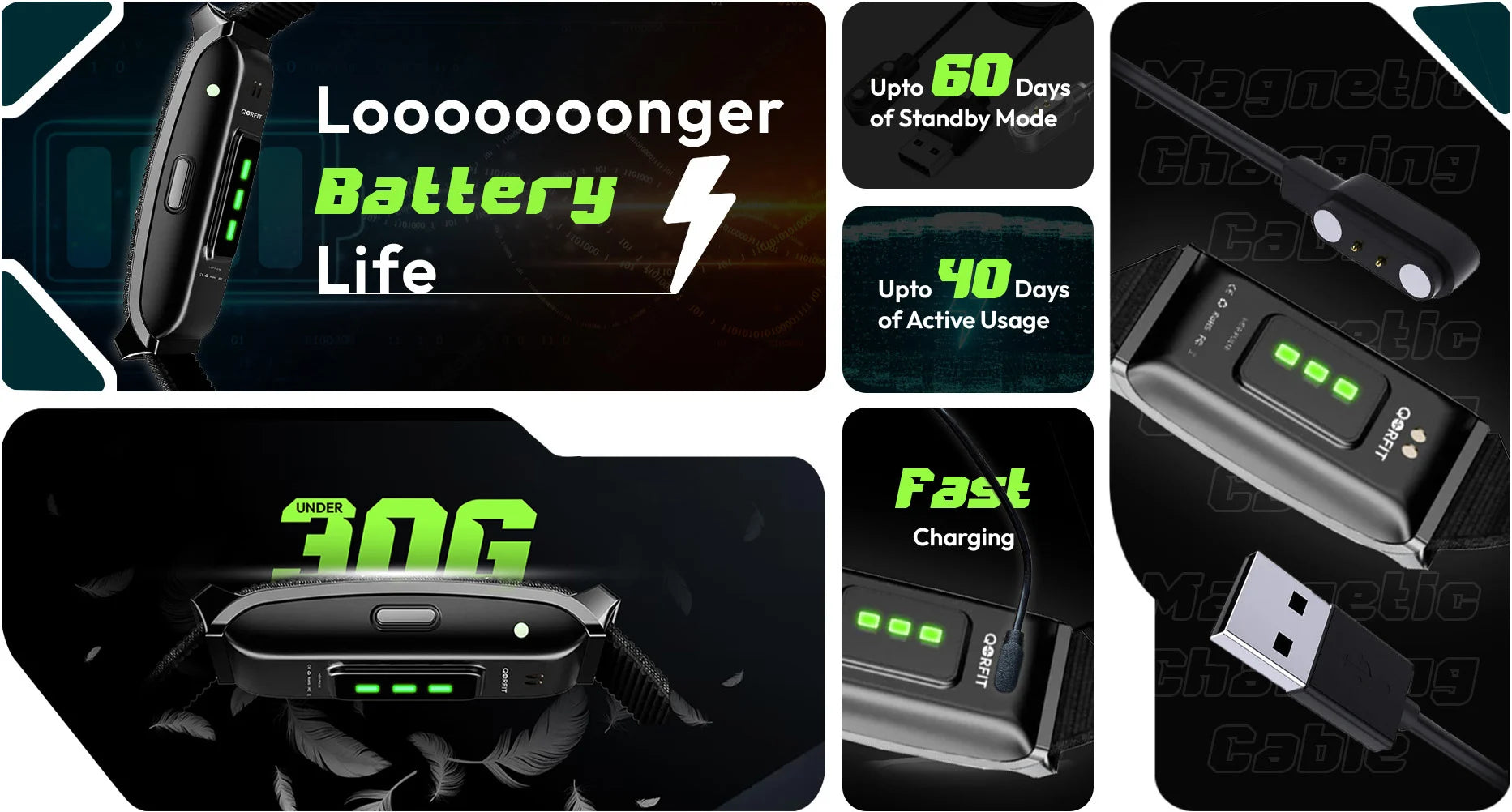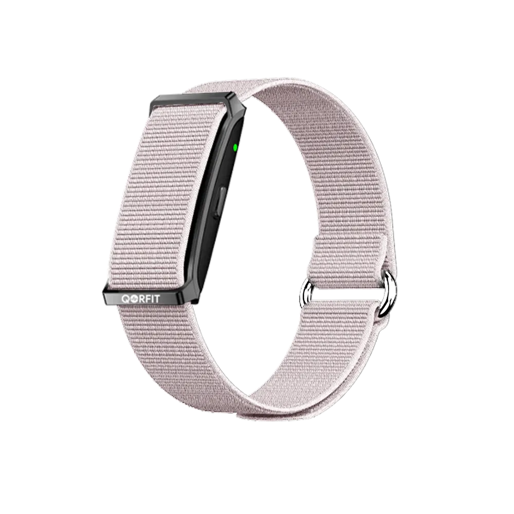 Two bands are included with the Qorfit Pulse: one black nylon and one black silicone. Colour bands are sold separately in packs of 5, available in two types — EVERYDAY CORE and VIBE CORE.