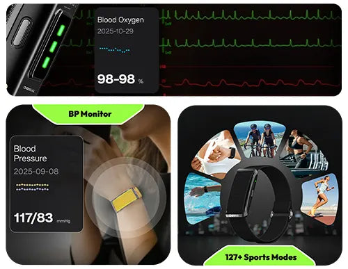 No screen; designed for distraction-free continuous health data.