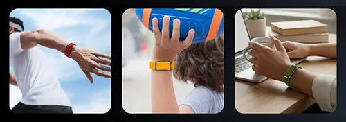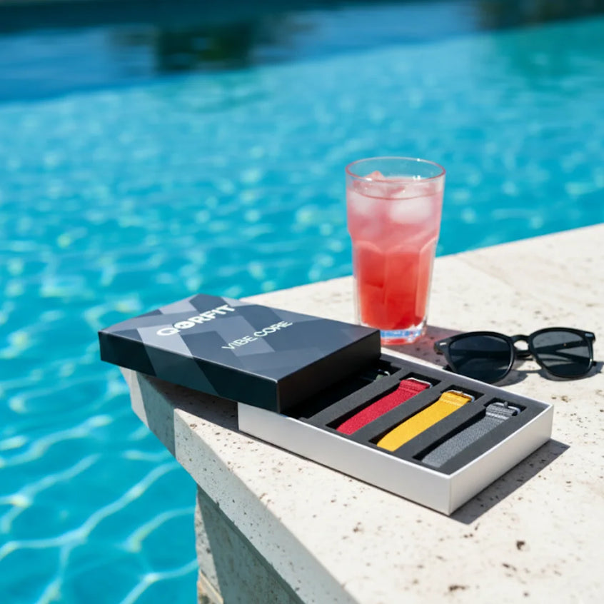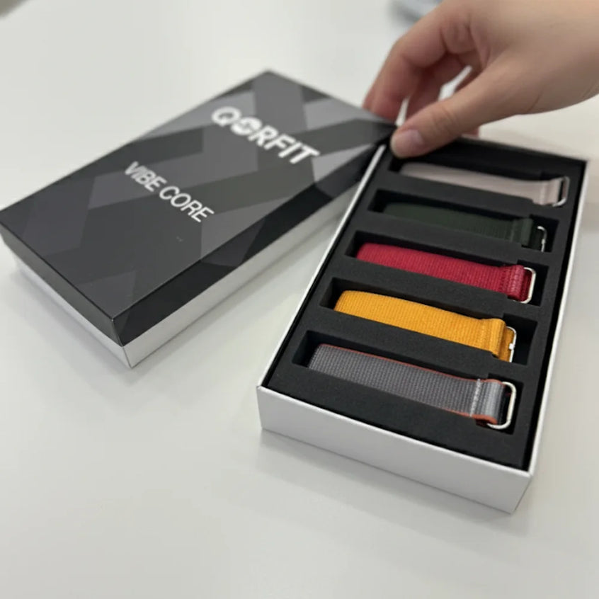 Two bands are included with the Qorfit Pulse: one black nylon and one black silicone. Colour bands are sold separately in packs of 5, available in two types — EVERYDAY CORE and VIBE CORE.